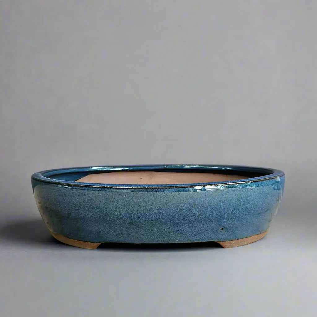 27cm glazed bonsai pot by Yorkshire Bonsai. Oval shape. Dimensions: 27cm x 22cm x 7cm. Blue glazed finish.