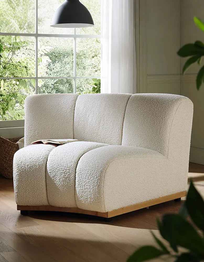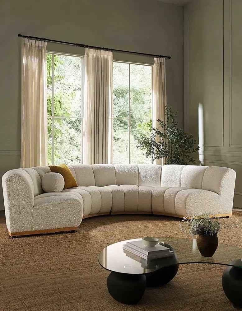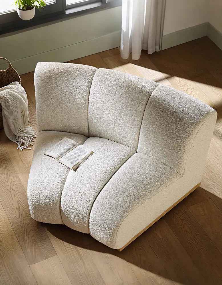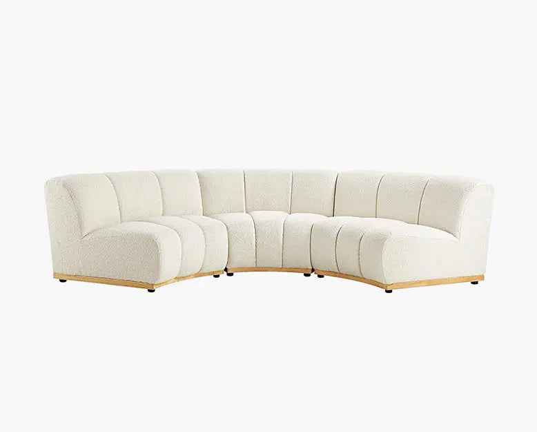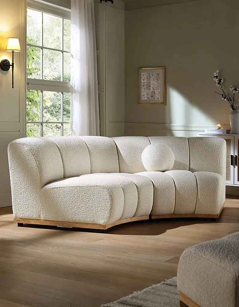 The Zafar Modular Sofa is an addition to any modern living space. Crafted with an elegant armless design, this curved sofa offers comfort and style. Upholstered in luxurious white boucle fabric, it provides sophistication, comfort and support.