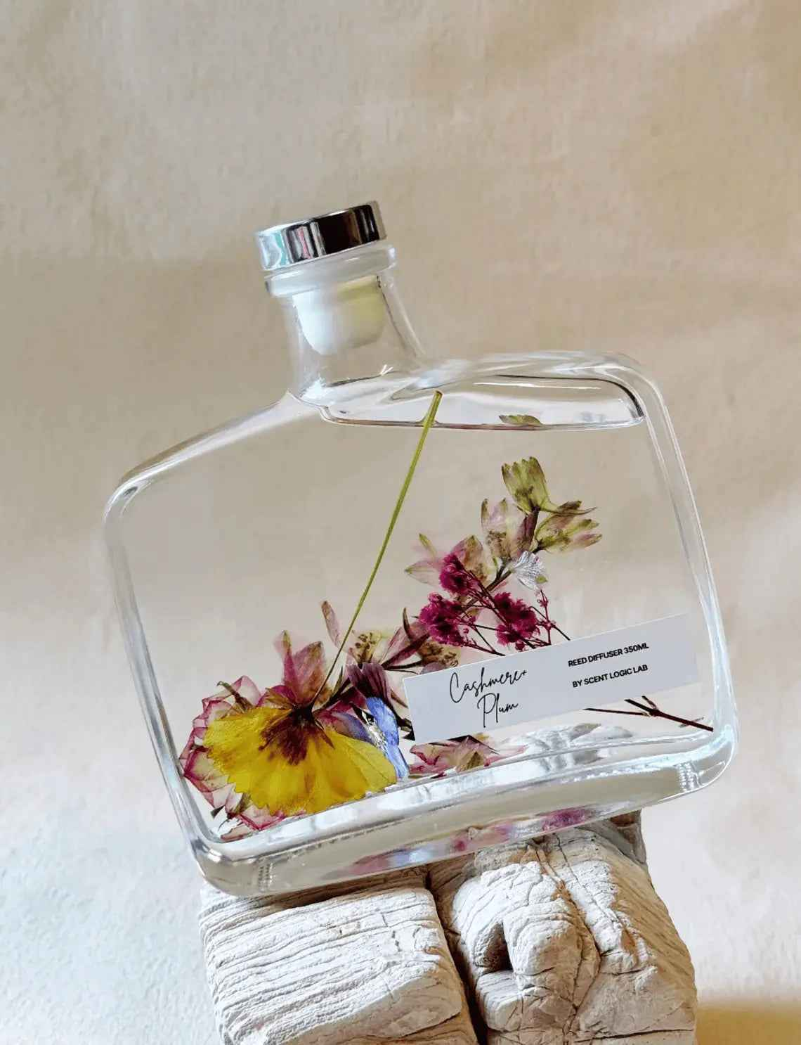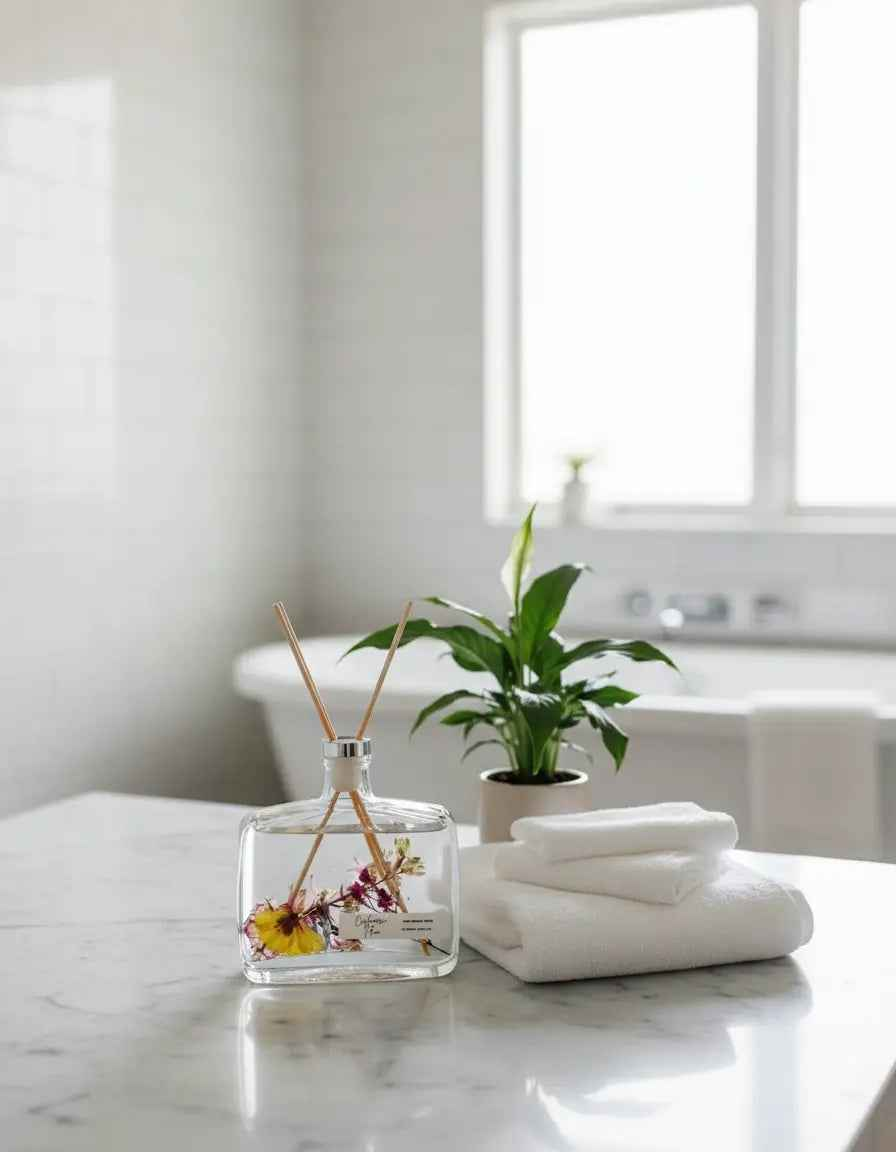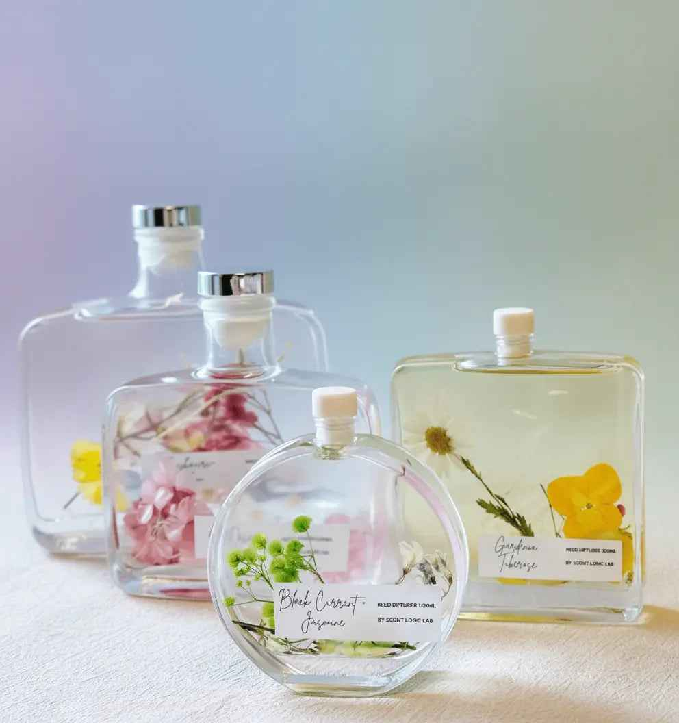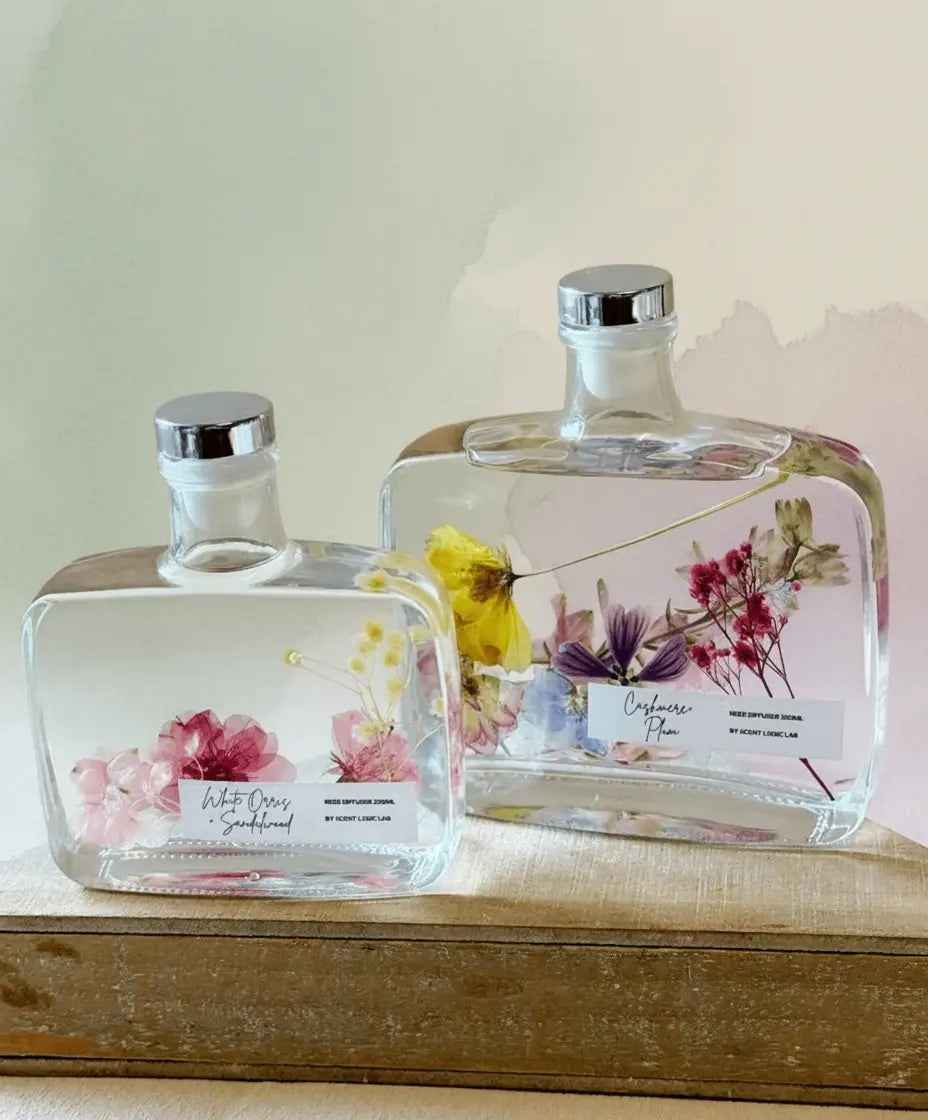 Handmade reed diffuser with botanical essential oils. 12 oz capacity glass vessel with natural reeds.